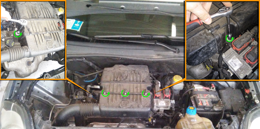 Seguono le fasi per la sostituzione del filtro aria per una Fiat Grande Punto 1.2 anno 2010.