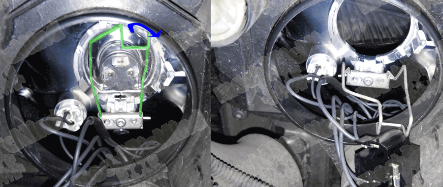 - Sganciare la molla (evidenziata in verde in figura 3) spingendola verso l’interno e poi verso destra