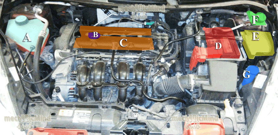 Segue la descrizione del vano motore di una Ford Fiesta Serie 6 del 2008.