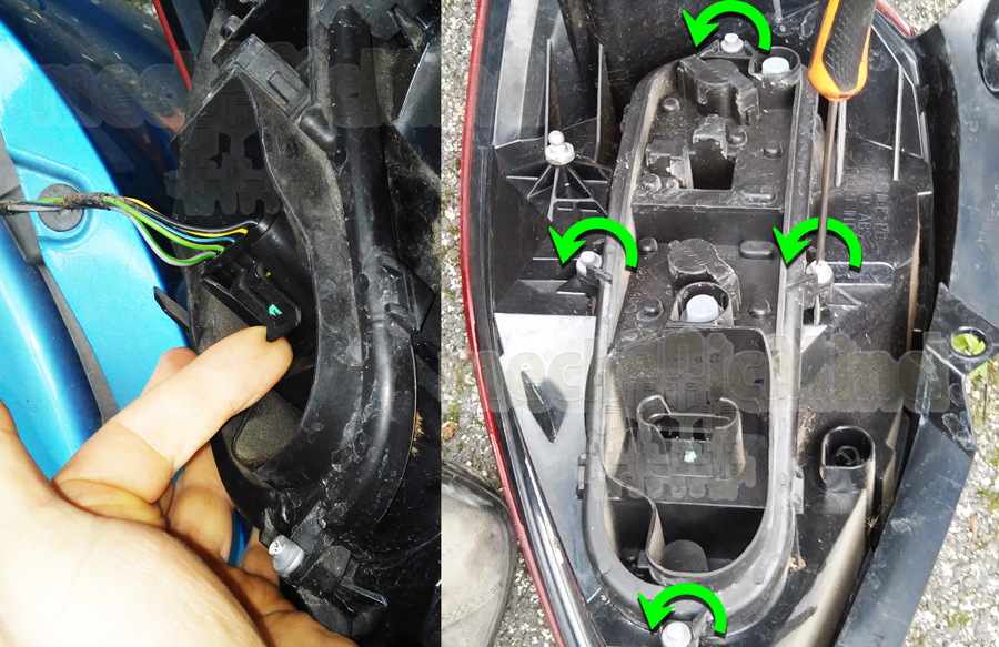 - Rimuoviamo il connettore elettrico e le quattro viti che agganciano il porta lampade al fanale