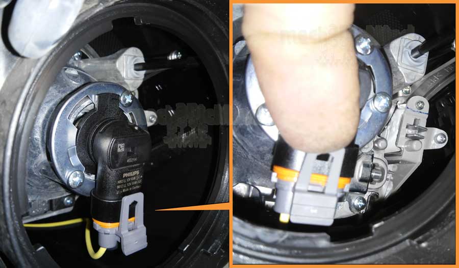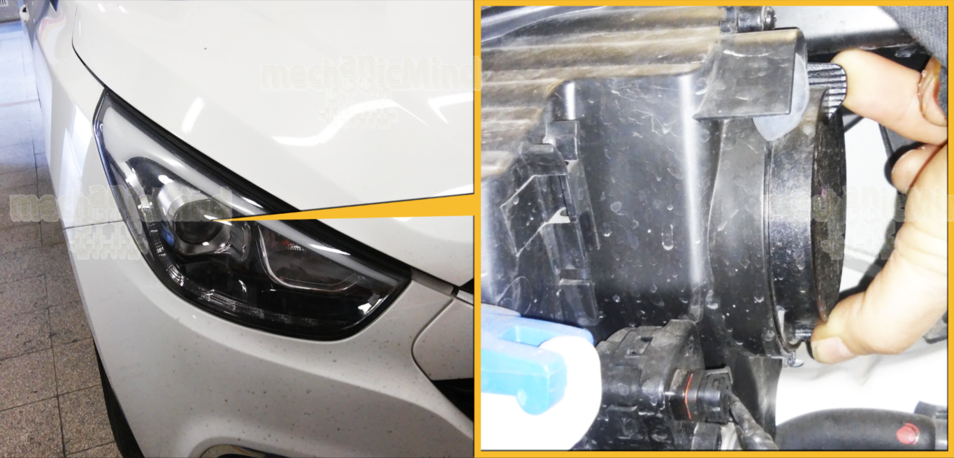 Consideriamo la sostituzione della lampadina anabbagliante, lato passeggero, di una Hyundai ix35 (in produzione dal 2009 al 2015). Il tipo di lampadina è una HIR2 (da 12 V e 55W) ad un solo filamento.