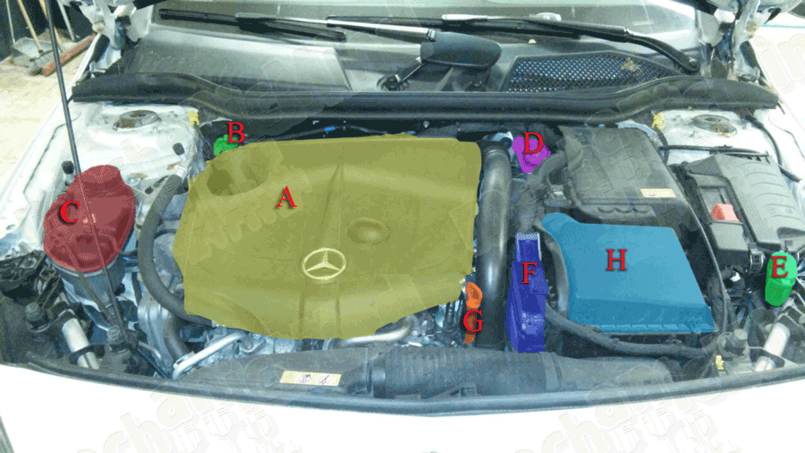 Vediamo assieme come sono disposti i componenti di maggior interesse all’interno del vano motore per una Classe A W176 CDI 200.