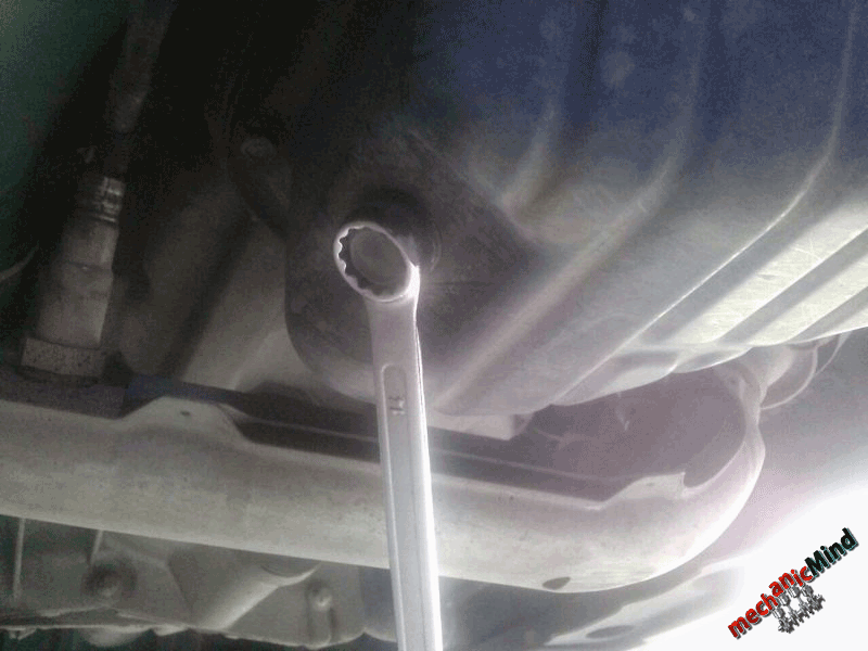 - Svuotare la coppa dell’olio. Facendo uso di una chiave 14 andremo a svitare il tappo dell’olio (vedi figura), situato sulla coppa, sotto al veicolo, avendo avuto premura di disporre la bacinella in corrispondenza del tappo.