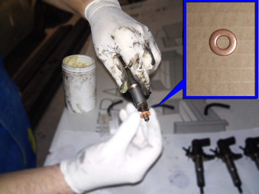 - Inseririamo le nuove guarnizioni: quella in rame direttamente sulla base dell’iniettore. Quella in gomma più grande sulla sommità del collettore di aspirazione e l’altra all’interno della sede dell’iniettore