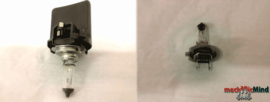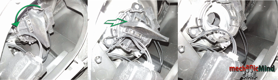 In seguito sfilare la lampadina dal supporto in plastica ed inserire la nuova. In fine rimontiamo la lampadina sul faro ruotanto in senso orario, poniamo il tappo e blocchiamo quest’ultimo con il fissaggio metallico.